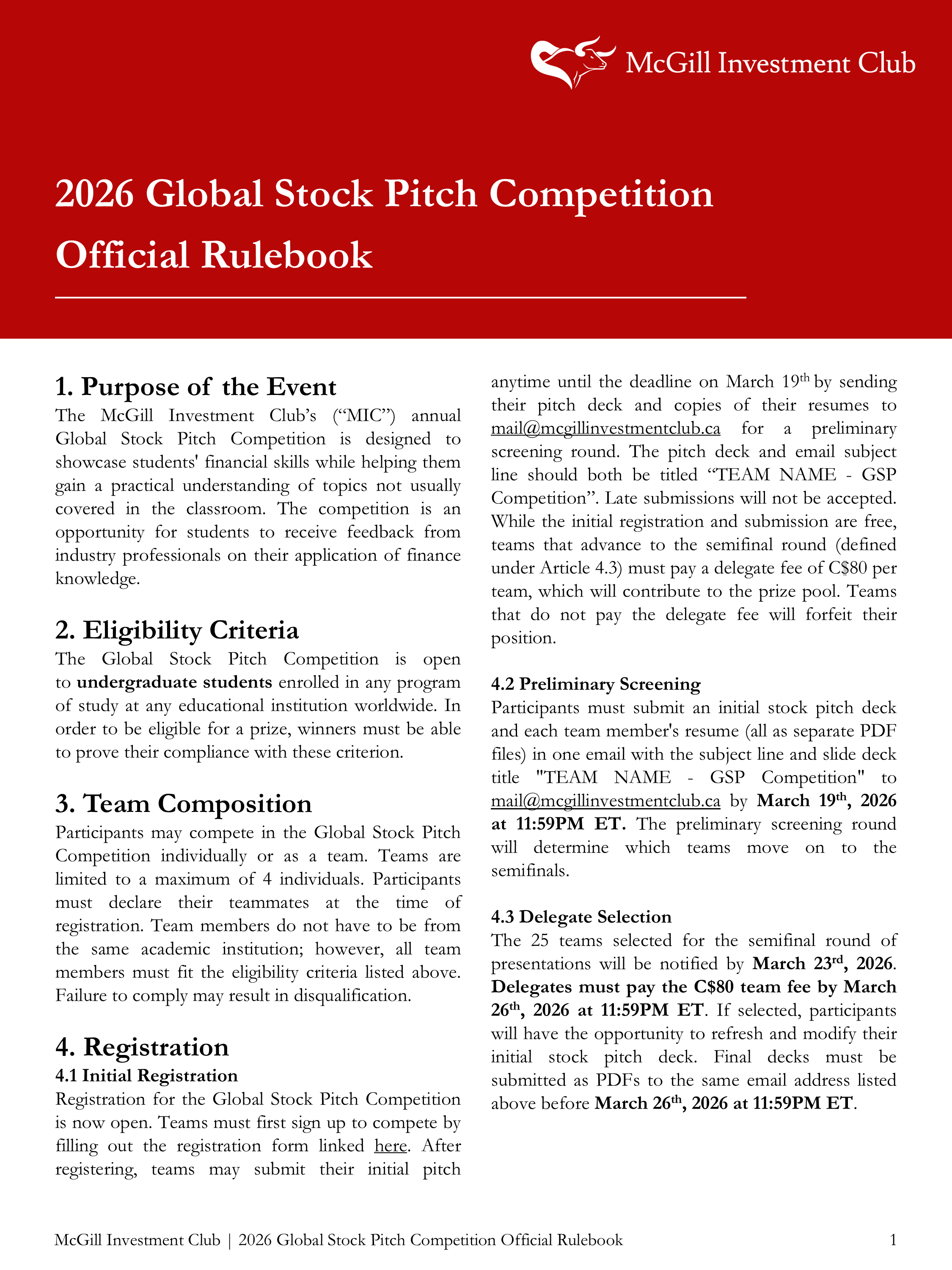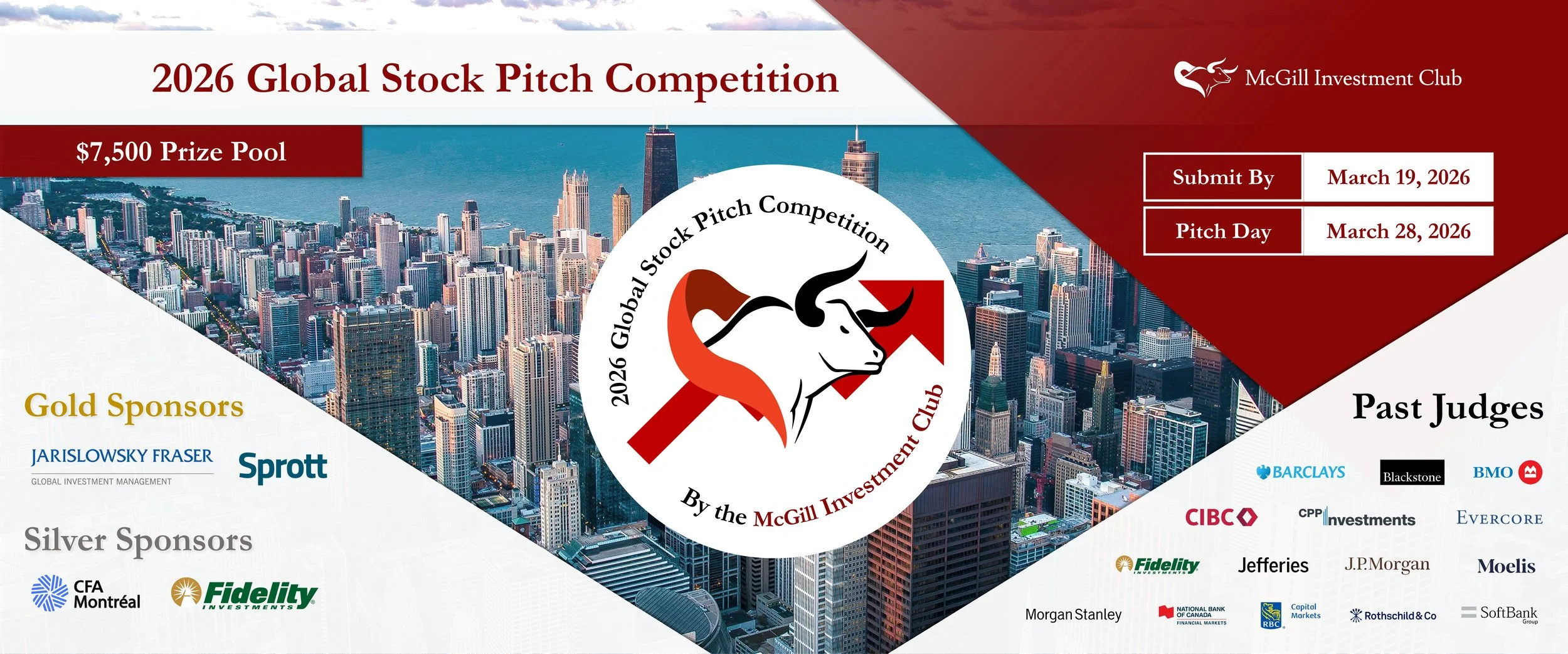 The McGill Investment Club (“MIC”) is excited to present its annual Global Stock Pitch Competition (“GSP”), open to all undergraduate students worldwide. On March 28th, 2026, teams of 1-4 will compete for a prize pool of C$7,500.